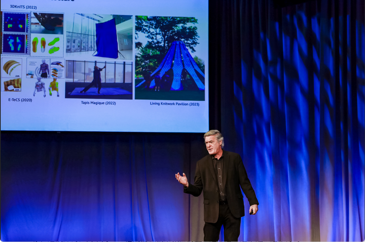 约瑟夫·帕拉迪索讲述,智能纤维超脱普通丝线,是将微缩至0.9毫米的集成电路嵌入可编织的柔性电路中,可具备光、声或微刺激等反馈机制,还能用于算法验证和信号交互。