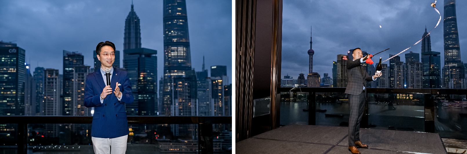 移步夜景迷人的露台区域后,酒店业主公司代表朱颖女士和酒店总经理金陵先生分别致辞,随后Spago Shanghai 总经理史昕昊先生以瑞吉酒店品牌经典的马刀开香槟仪式为开业仪式带来了完美且隆重的高潮。
