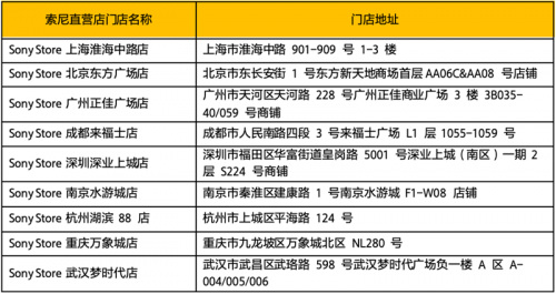 更多实时动态,敬请关注索尼中国在线商城(https://www.sonystyle.com.cn/)、索尼影像圈官方微博(http://weibo.com/diclubsony)或索尼中国微信公众号(微信号:sonycn_001)和索尼影像圈官方微信公众号(微信号:sonycn_002)或垂询以下门店。