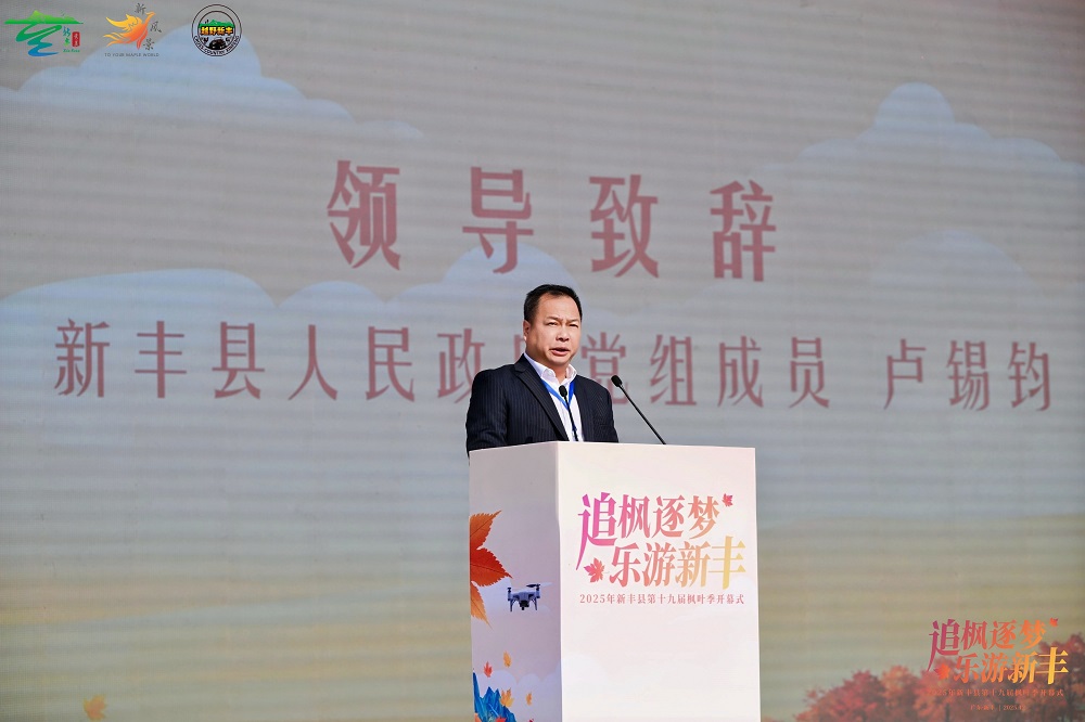开幕式在气势恢宏的英歌舞表演中拉开帷幕,以其特有的铿锵律动,生动诠释了新丰文旅守正创新、开放融合的时代姿态。新丰县政府党组成员卢锡钧在致辞中为本届活动定下基调。他指出,新丰作为粤港澳大湾区的“天然氧吧”,正将一年一度的枫叶季打造为递向全国的生态文旅“金名片”,是践行“绿水青山就是金山银山”理念的生动实践。致辞中强调,本届活动以“文旅+”为引擎,特别注重与低空经济的创新融合,致力于通过“空中观枫”等特色体验,将“新风景”低空文旅品牌推向更广阔的市场,为全域旅游发展注入科技动能与新活力。