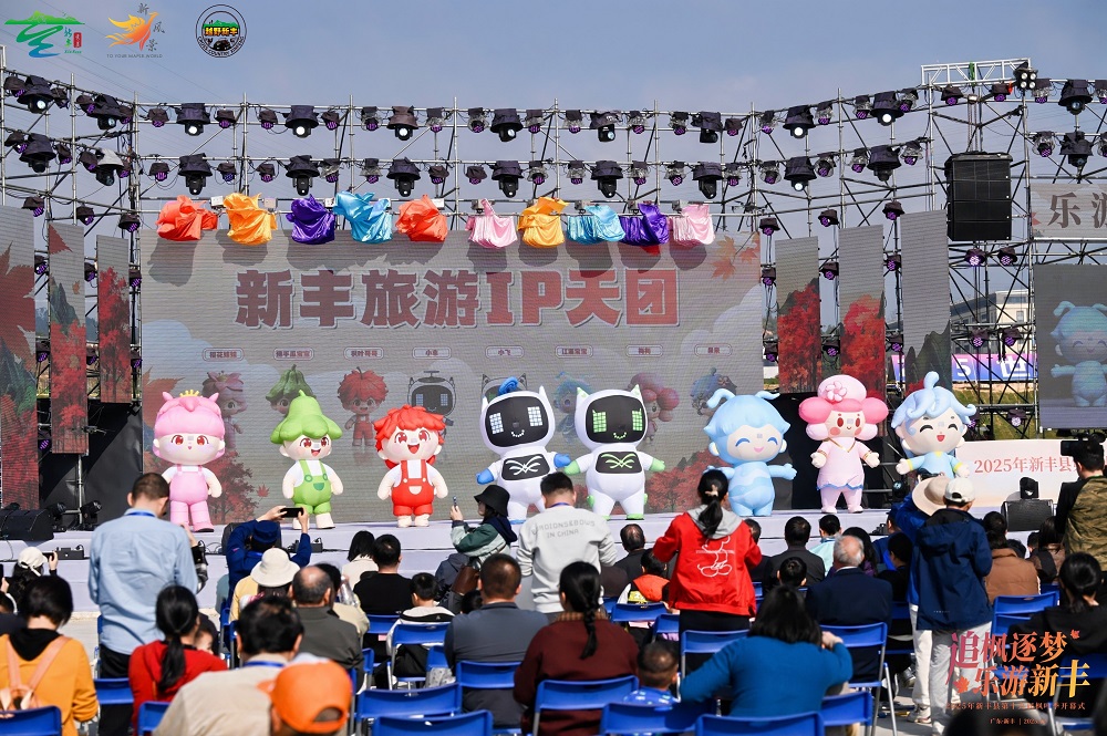 活动核心环节环环相扣,集中展示了新丰文旅的品牌建设与产业生态。承载着新丰文旅特色的旅游IP天团首次集体亮相,“枫叶哥哥”、“樱花妹妹”、“佛手瓜宝宝”、“梅梅宝宝”、“泉泉宝宝”、“江源宝宝”以及“丰飞侠”组合齐聚,将当地生态物产与文化符号人格化、故事化,标志着新丰文旅迈入品牌叙事新阶段。